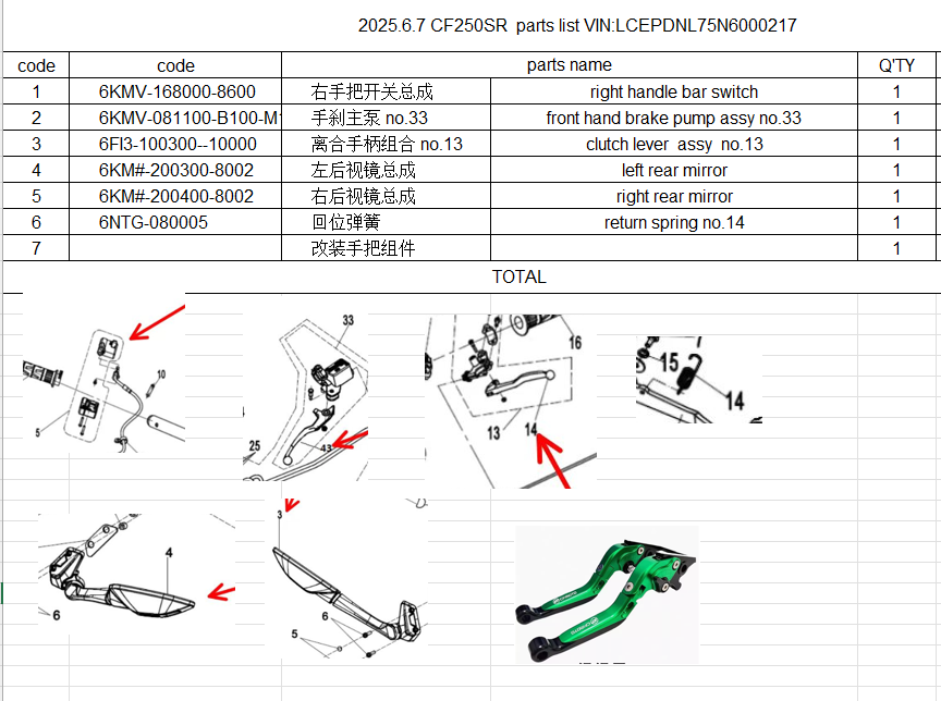 Right handle bar switch/front hand brake pump assy/clutch lever assy /rear mirror and others in the list suit CF250SR