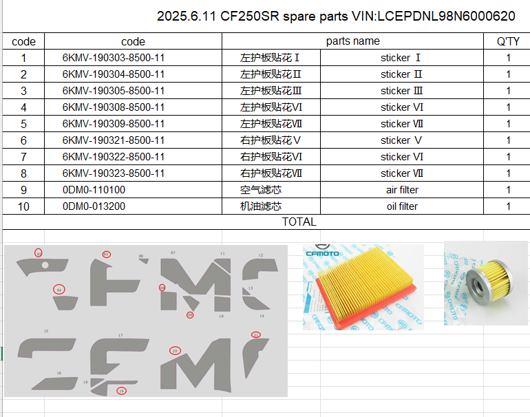 stickers and air filter and oil filter suit CF250SR 0DM0-110100/0DM0-013200