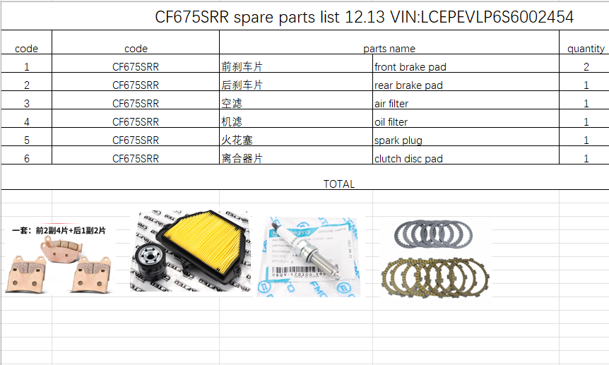 Air Filter/Oil Filter/Front and rear Brake pad /spark plug and Clutch Pad suit CF675SRR