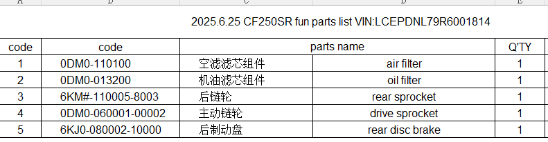 Air Filter/Oil filter/rear sprocket/drive sprocket and rear disc brake suit CF250SR 6KJ0-080002-10000