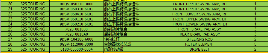 Swing arm/brake pad/Steering Tie Rod/filter and drive belt suit CF625 TOURING
